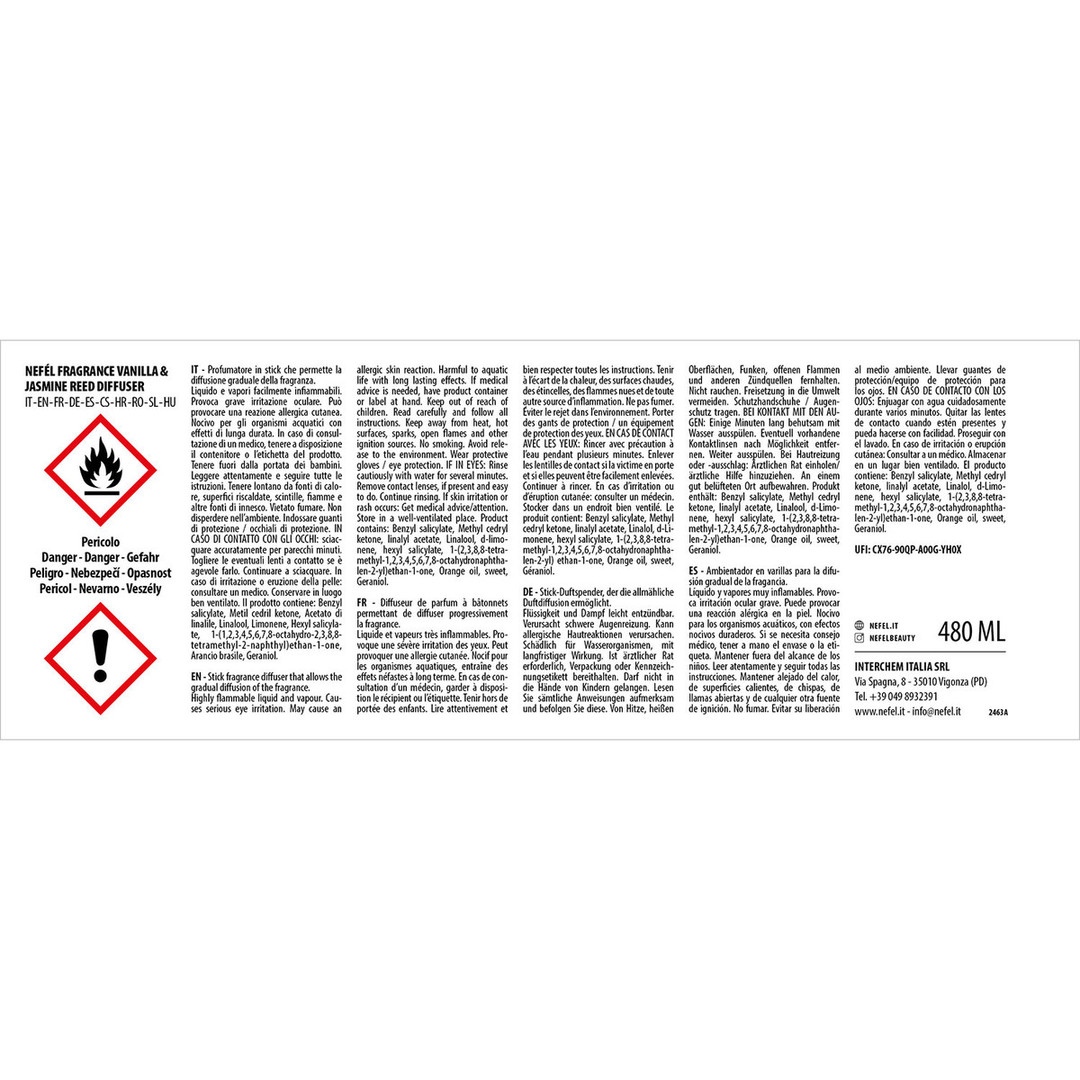 Dišava s palčkami Nefel Vanilla & Jasmin 480 ml proizvajalca Interchem Italia je eleganten difuzor za dolgotrajno in enakomerno odišavljanje prostorov. S pomočjo palčk omogoča postopno sproščanje dišave, ki ustvarja prijetno in harmonično atmosfero.