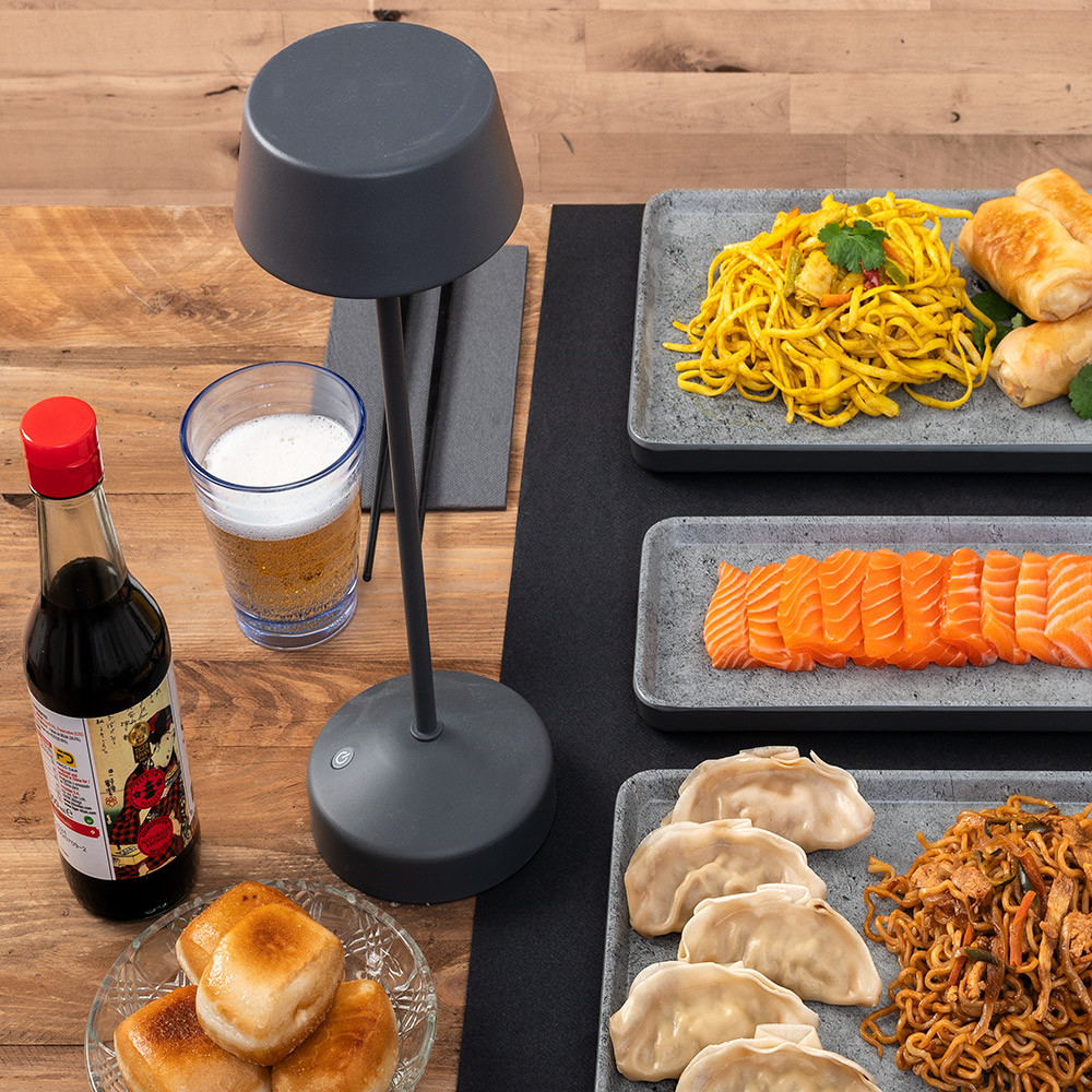 Opremljena je z dimmer funkcijo, ki omogoča prilagajanje jakosti svetlobe glede na ambient in potrebe prostora. Topla LED svetloba (cca. 3000 K) ustvarja prijetno vzdušje, idealno za restavracije, hotele, terase ali lounge prostore. Svetilka se polni preko USB kabla, kar zagotavlja enostavno uporabo in fleksibilnost pri postavitvi.