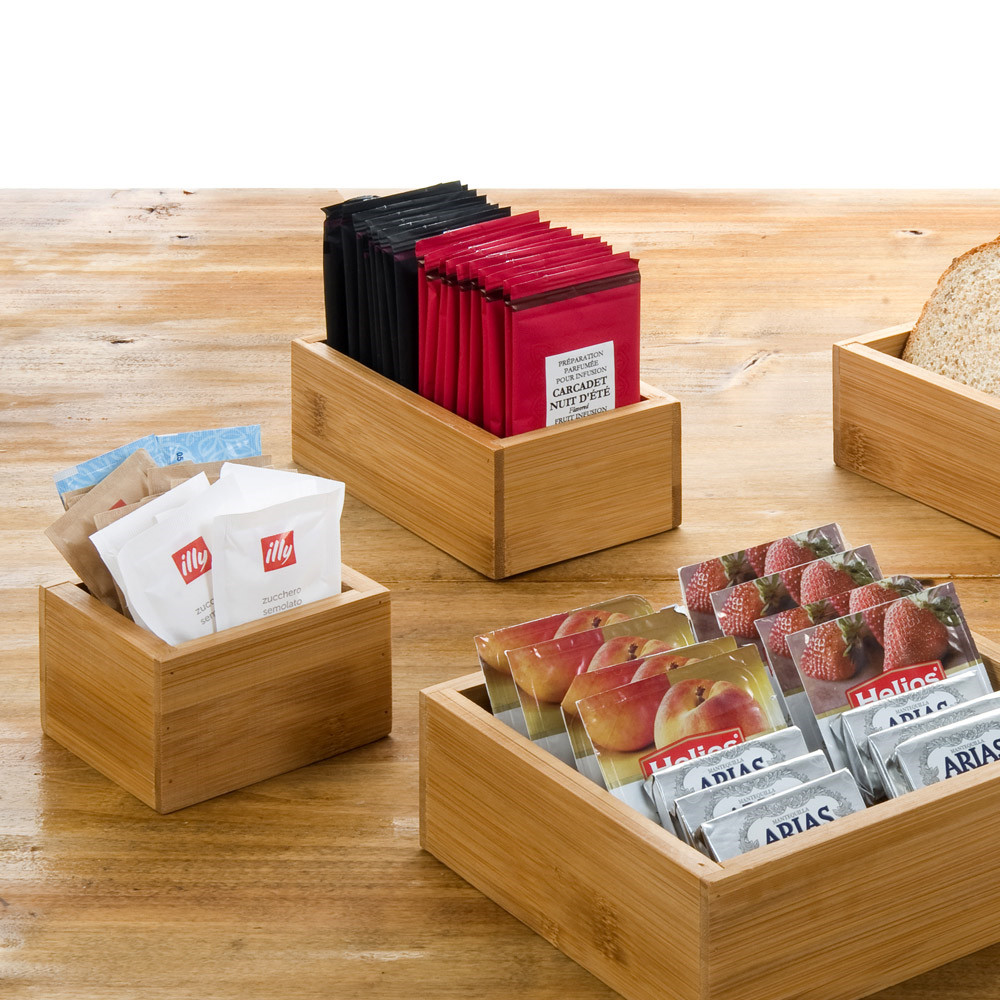 Lesen Buffet Box ’BAMBOO’ 15,5 × 15,5 × 5 cm (koda 223.87) je priročen servirni zaboj iz naravnega bambusa, zasnovan za uporabo pri buffet postavitvah, cateringu, restavracijah, hotelih ali domači uporabi. Zaradi kompaktnih dimenzij je idealen za organizirano postavitev malih jedi, prigrizkov ali dodatkov, ki popestrijo buffet ponudbo ali mizo za postrežbo. Bambus kot naraven material je odporen na olja in maščobe ter primeren za stik s hrano, hkrati pa daje ambientu topel, naraven in estetski videz.