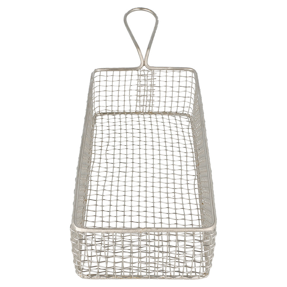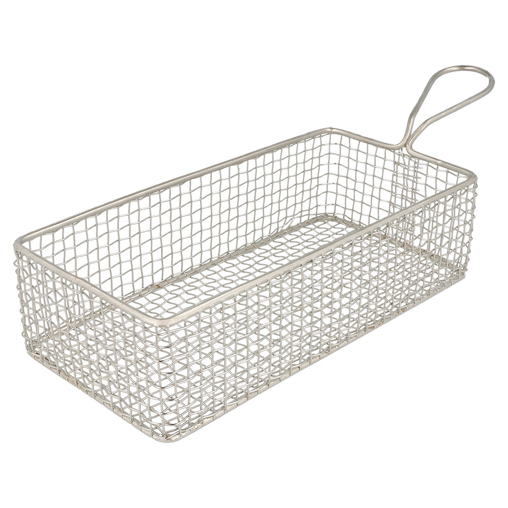 Servirna kovinska mrežasta košarica v velikosti 22 x 10 x 6 cm je praktična in elegantna rešitev za postrežbo prigrizkov, pomfrija, finger food-a, predjedi ali drugih malih jedi. Pakiranje vsebuje 6 kosov, kar omogoča uporabo v restavracijah, barih, cateringih ali domačih priložnostih.
