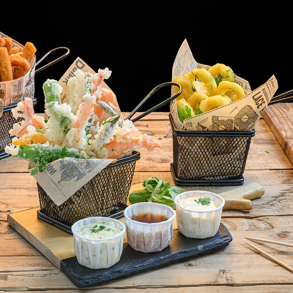 Servirna jeklena mrežasta košarica, črne barve, v velikosti 10 x 7,8 x 7 cm je praktična in elegantna rešitev za postrežbo prigrizkov, pomfrija, finger food-a, predjedi ali drugih malih jedi. Pakiranje vsebuje 6 kosov, kar omogoča uporabo v restavracijah, barih, cateringih ali domačih priložnostih.