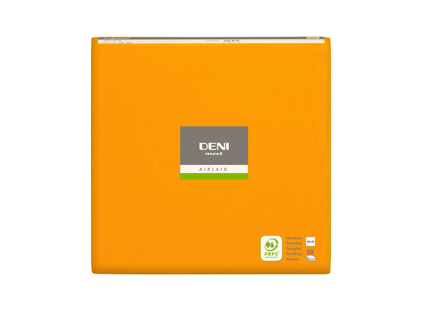 Servieti AirLaid ORANŽNI dimenzij 40 x 40 cm Prednost Airlaid materiala je visoka vpojnost. Zaradi kakovosti in trdnosti tekstilnega videza servieti omogočajo oblikovanje dekoracij. Surovina: Premium Airlaid material, 100 % celuloza Barva: ORANŽNA Pakiranje: 600 servietov / karton Na voljo v različnih barvah.