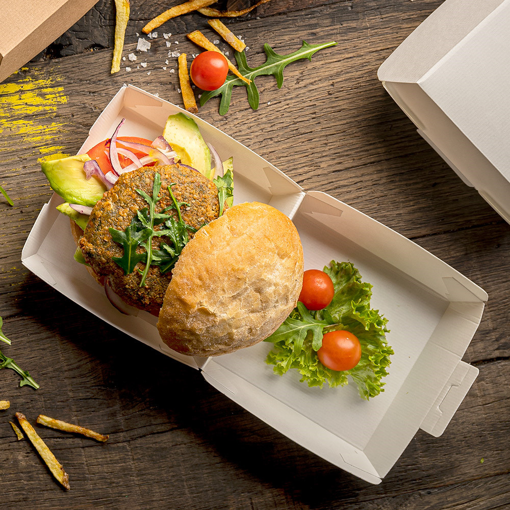 Model XL WIDER je zasnovan za širše in večje burgerje ter obroke, kjer je potrebna večja notranja površina za burger, priloge in dodatke. Škatla omogoča varno zapiranje, ki preprečuje razlitje in ohranja obliko hrane med transportom in dostavo.