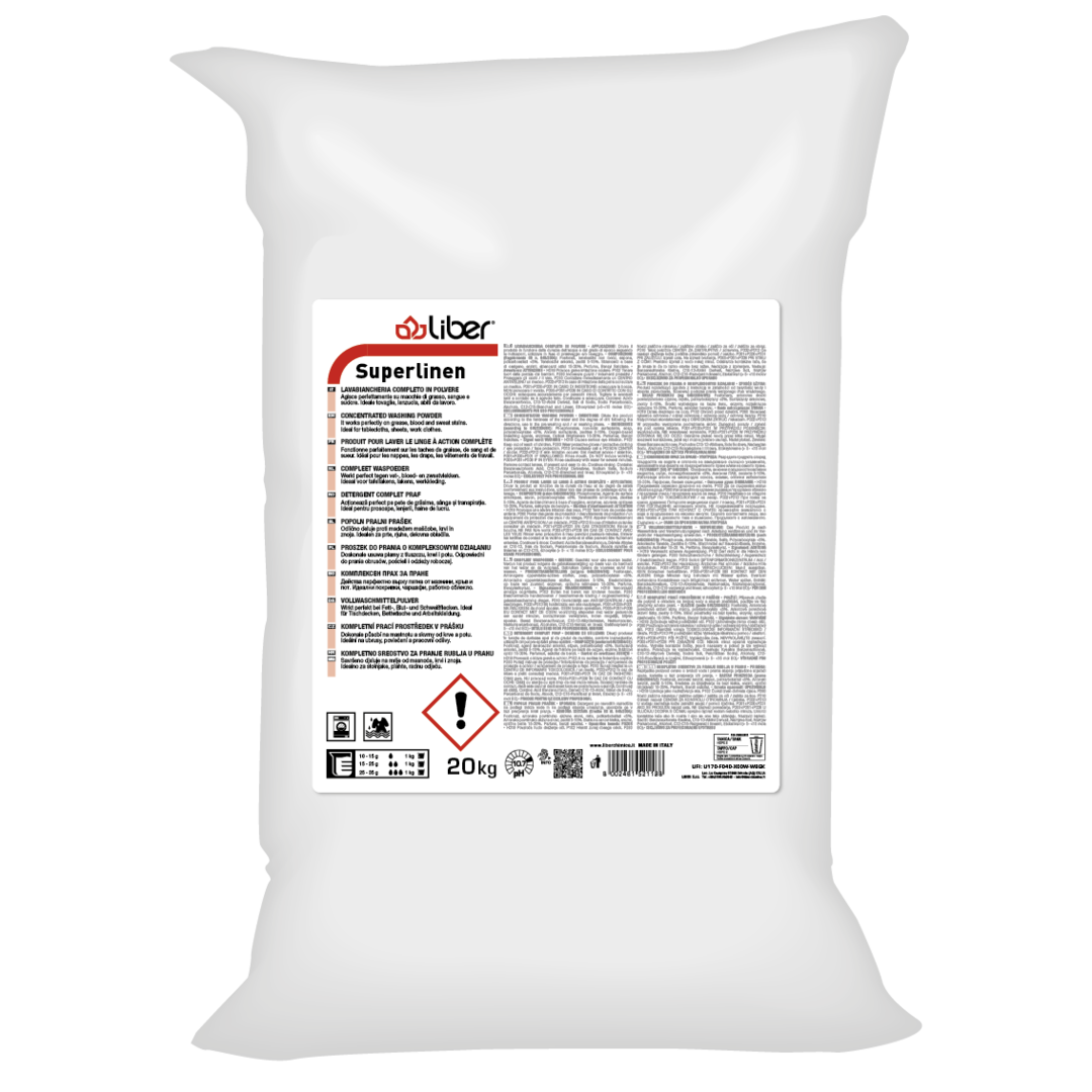 Superlinen je profesionalni detergent v prahu proizvajalca Liber Italija, posebej zasnovan za učinkovito čiščenje perila v pralnicah in industrijskih obratih. Izdelek je primeren tako za uporabo v pralnih strojih kot tudi za ročno pranje, saj njegova formula deluje pri vseh temperaturnih nastavitvah in s katero koli trdoto vode.