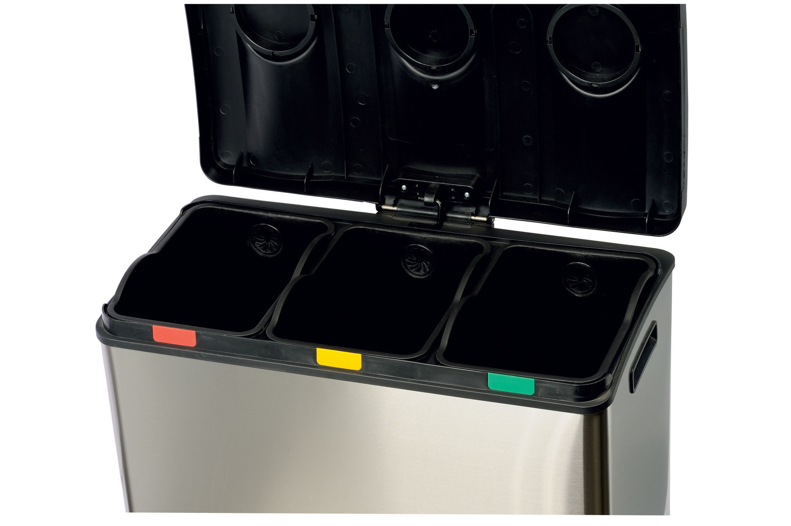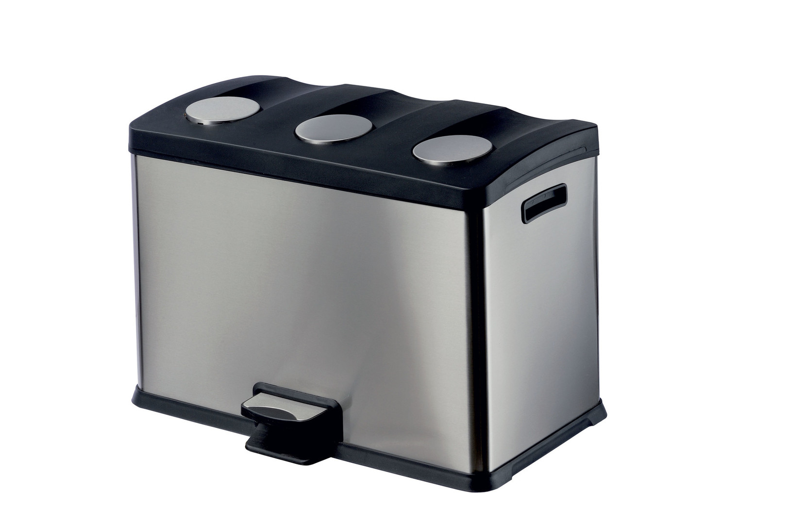 Opremljen je s tremi ločenimi notranjimi posodami, ki omogočajo ločevanje različnih vrst odpadkov. Pedalni mehanizem omogoča brezkontaktno uporabo, pokrov pa se zapira tiho in kontrolirano. Zaradi robustne konstrukcije in stabilne ABS osnove je koš primeren za intenzivno uporabo v pisarnah, hotelih, sanitarijah in drugih javnih prostorih.