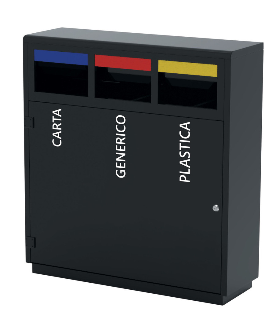 Koš ima tri ločene odprtine z barvnimi oznakami, ki omogočajo enostavno in pregledno ločevanje različnih vrst odpadkov. V notranjosti so nameščeni trije nosilci za vreče, dostop do njih pa je omogočen preko sprednjih vrat z varnostnim zaklepanjem na trikotni ključ, kar preprečuje nepooblaščen dostop.