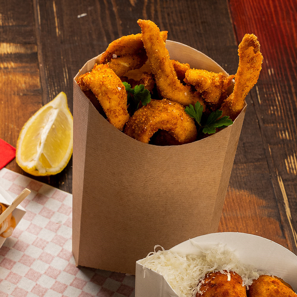 je večja in robustna embalaža, namenjena serviranju pomfrija, ocvrtih prigrizkov, nuggetsov ter drugih street food jedi. Izdelana je iz naprednega nano-mikro valovitega kartona, ki zagotavlja odlično razmerje med trdnostjo, nizko težo in odpornostjo na maščobe ter vlago.