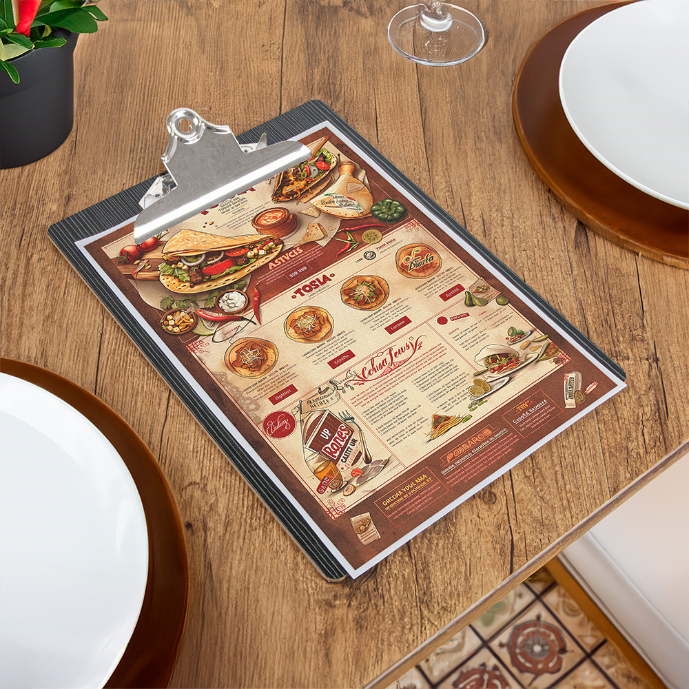 je črna prenosna podloga za papir – pogosto imenovana tudi clipboard ali menu holder z vpenjalno sponko – zasnovana za stabilno pritrditev papirjev, listov ali menijev v profesionalnih okoljih. Namesto klasičnega stojala ali papirne mape vam ta elegantna črna MDF podlaga z vpenjalno sponko omogoča hitro in varno pritrditev dokumentov, ki jih potrebujete na vidnem mestu ali med delom.