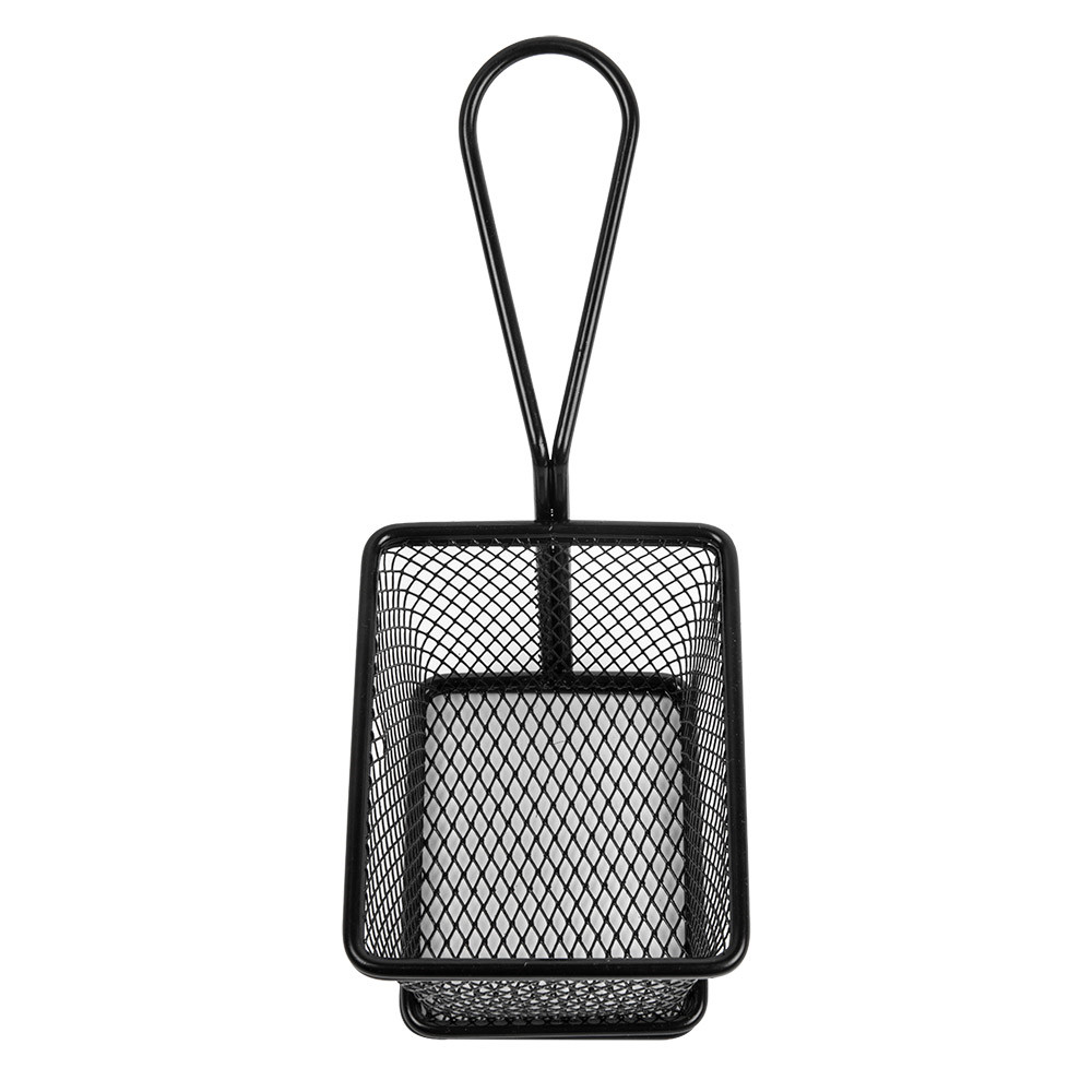 Servirna jeklena mrežasta košarica, črne barve, v velikosti 10 x 7,8 x 7 cm je praktična in elegantna rešitev za postrežbo prigrizkov, pomfrija, finger food-a, predjedi ali drugih malih jedi. Pakiranje vsebuje 6 kosov, kar omogoča uporabo v restavracijah, barih, cateringih ali domačih priložnostih.